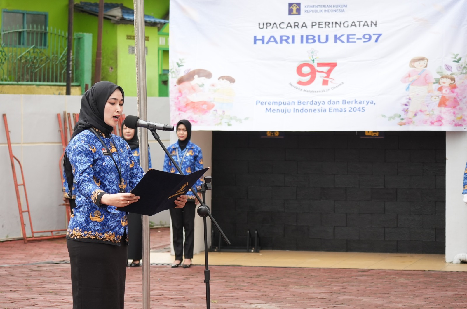 Upacara peringatan Hari Ibu ke-97 dipimpin oleh Kepala Bidang Pelayanan Kekayaan Intelektual, Yenni, yang bertindak selaku inspektur upacara.
