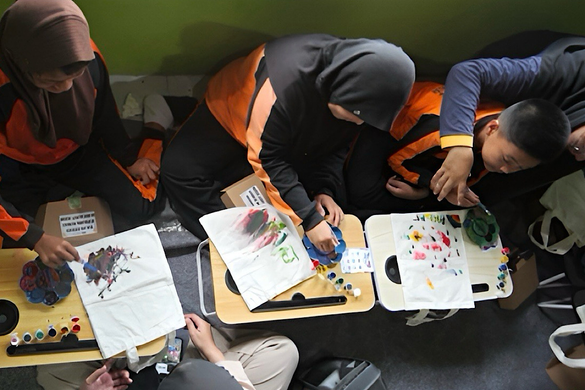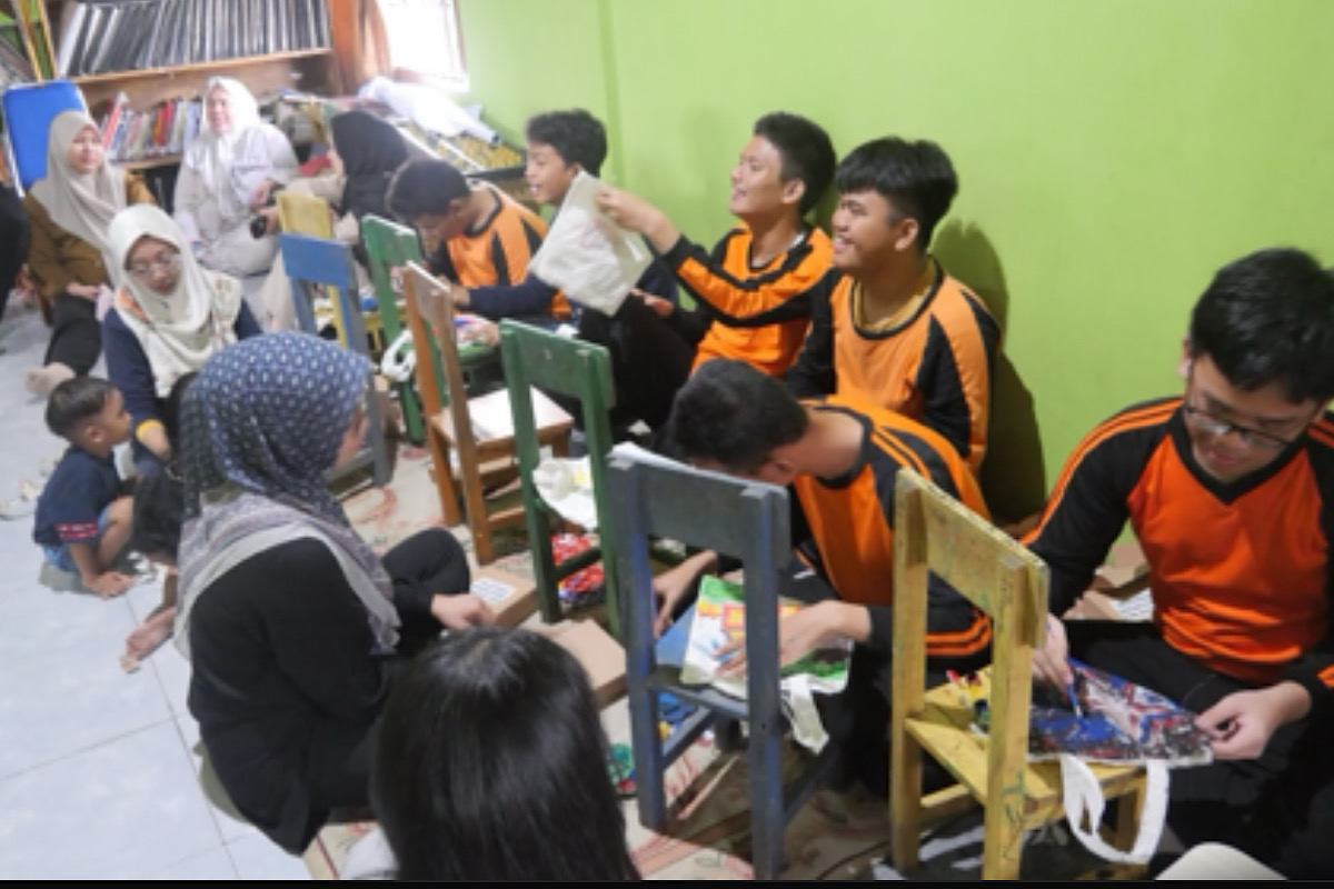 Didampingi oleh lima relawan, para siswa dengan penuh antusias menuangkan imajinasi mereka ke atas totebag polos yang dijadikan media lukis.